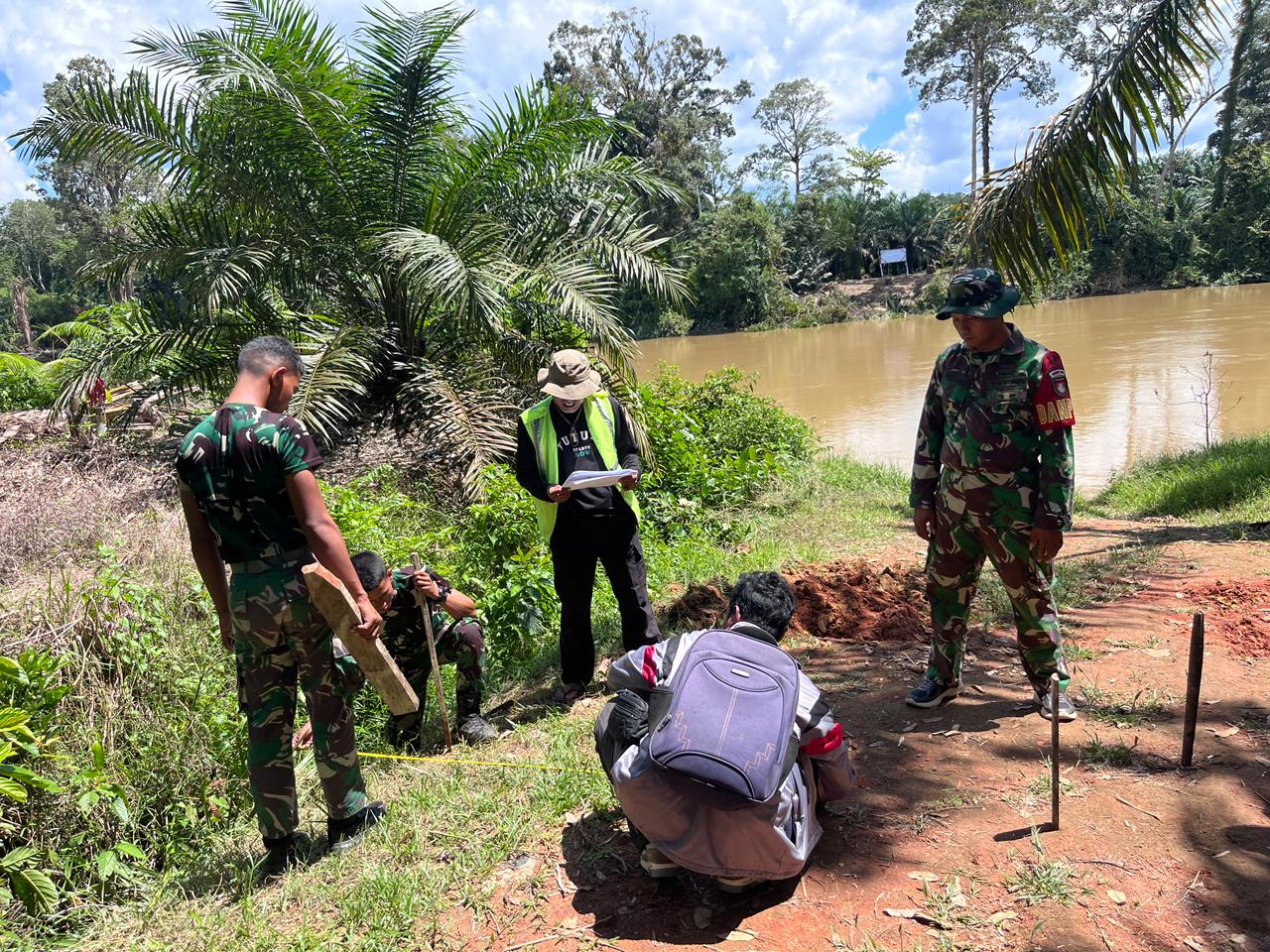 Personel Kodim 1015/Sampit menerjunkan tim bersama konsultan teknis untuk melakukan pengukuran akhir titik koordinat pembangunan Jembatan Garuda, Minggu (12/4/2026).