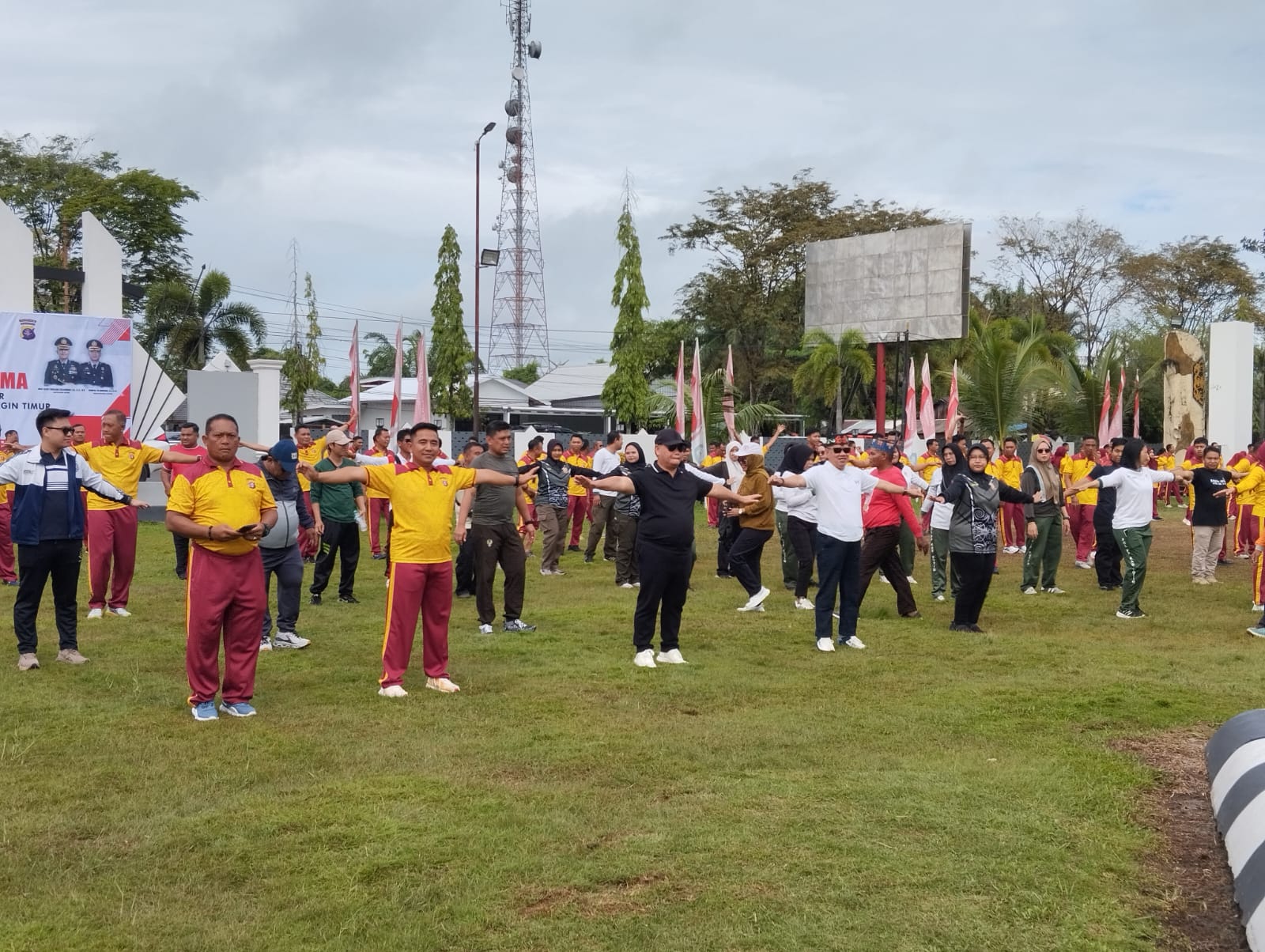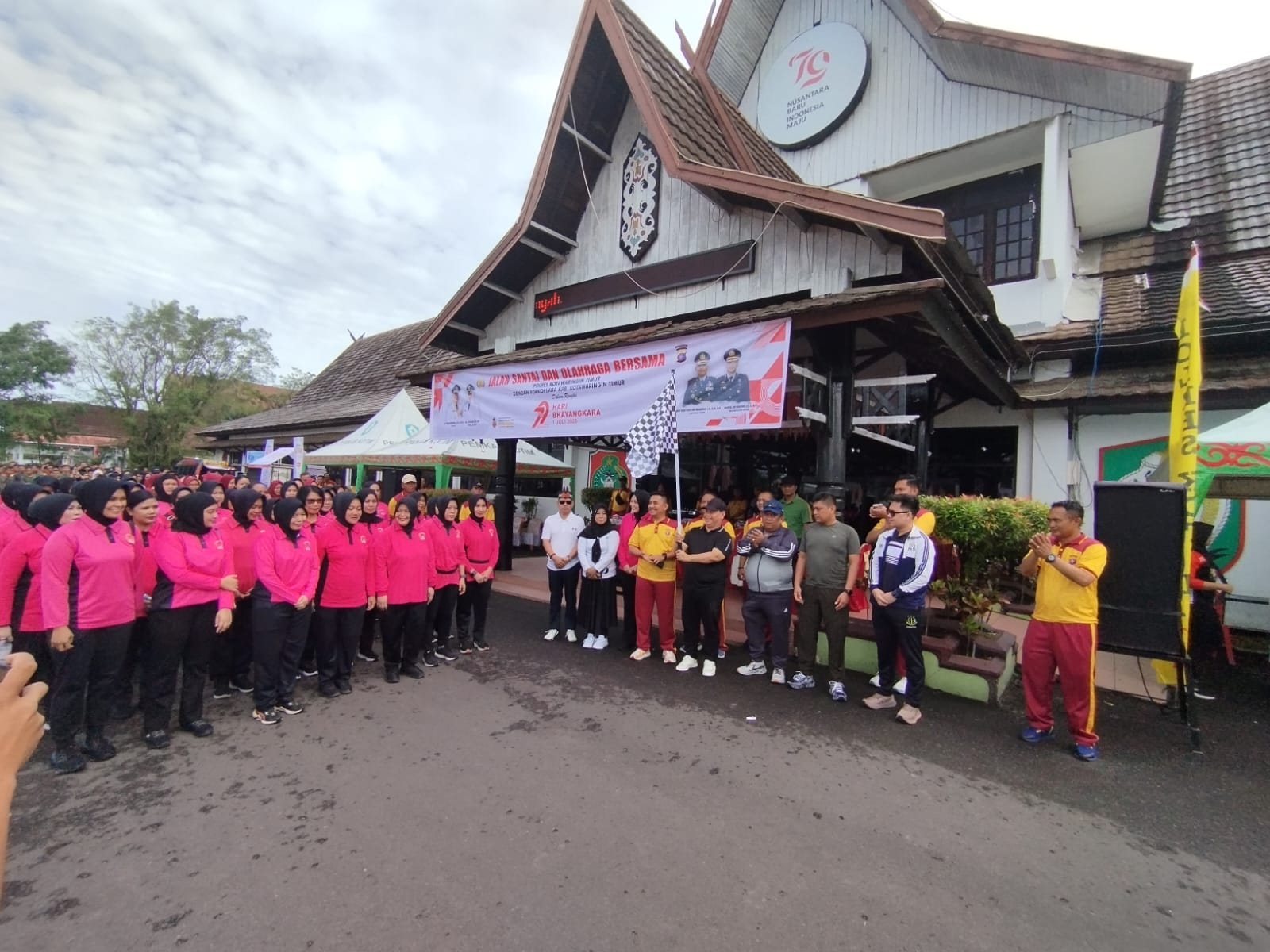 Olahraga bersama TNI-Polri dilaksanakan dalam rangka memperingati HUT Bhayangkara Ke-79 kali ini, diawali jalan santai dan senam bersama dilanjutkan dan pembagian doorprize.