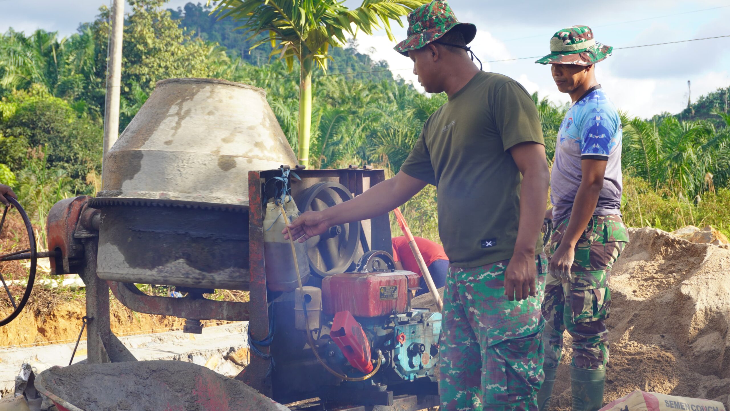 Kotawaringin Timur // Siberpatroli.co.id – Kebisingan mesin molen pengaduk material pasir, batu dan semen seringkali menimbulkan suasana tidak nyaman bagi siapa saja yang mendengarnya. Namun, tidak menjadi soal bagi masyarakat dan para prajurit TNI yang tergabung dalam Satuan Tugas TNI Manunggal Membangun Desa (Satgas TMMD Ke-127 Kodim 1015/Sampit yang sedang bergulat mengejar target pengerjaan siring badan jalan di desa Tri Buana, Kecamatan Telaga Antang, Kabupaten Kotawaringin Timur. Jum’at (20/02/2026).