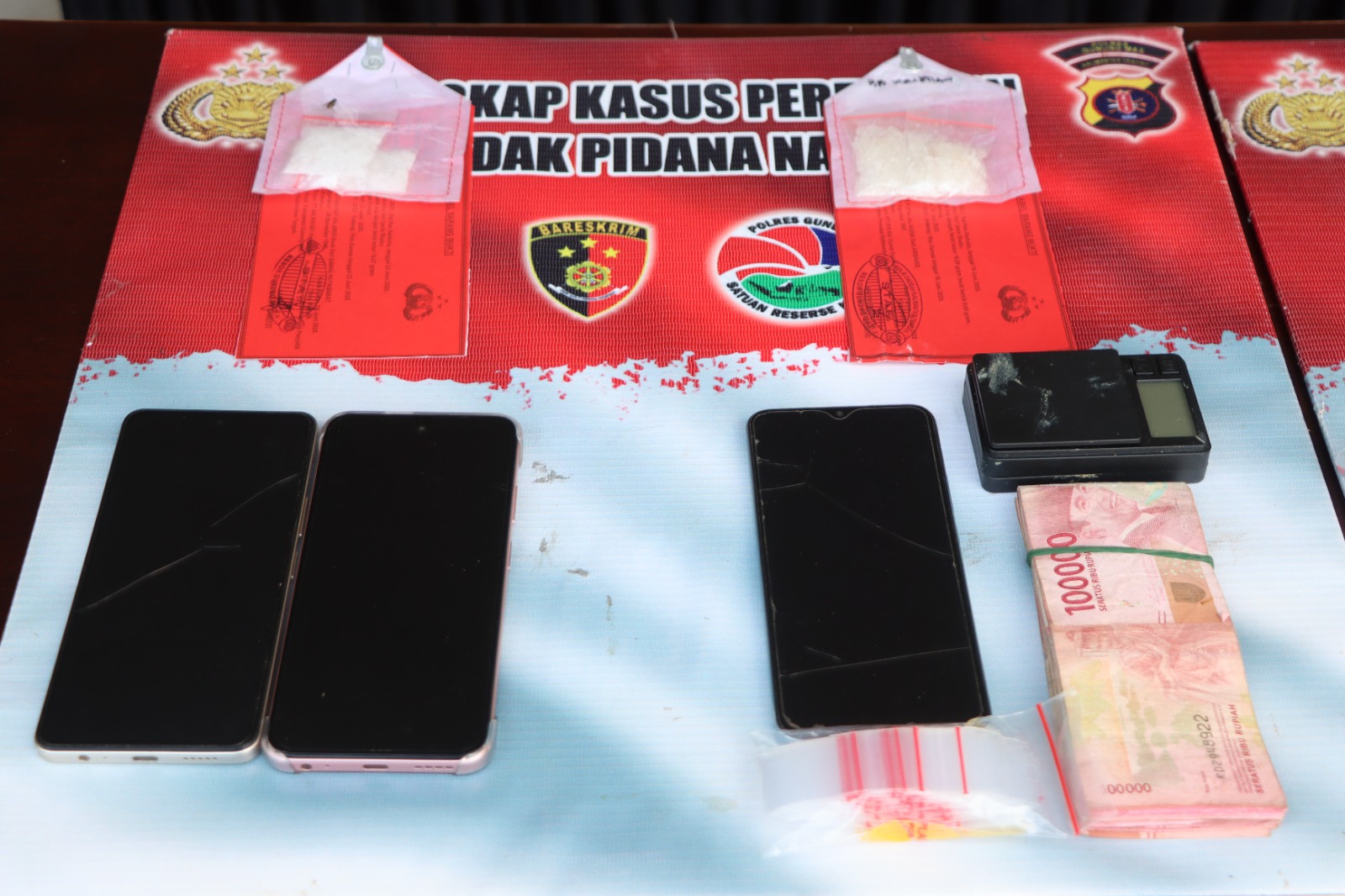Dari tangan para tersangka, Satresnarkoba berhasil mengamankan barang bukti narkotika jenis sabu dengan total berat kotor mencapai 220,14 gram. Jika dirupiahkan, nilai barang haram tersebut diperkirakan mencapai Rp 440.280.000,- (empat ratus empat puluh juta dua ratus delapan puluh ribu rupiah).