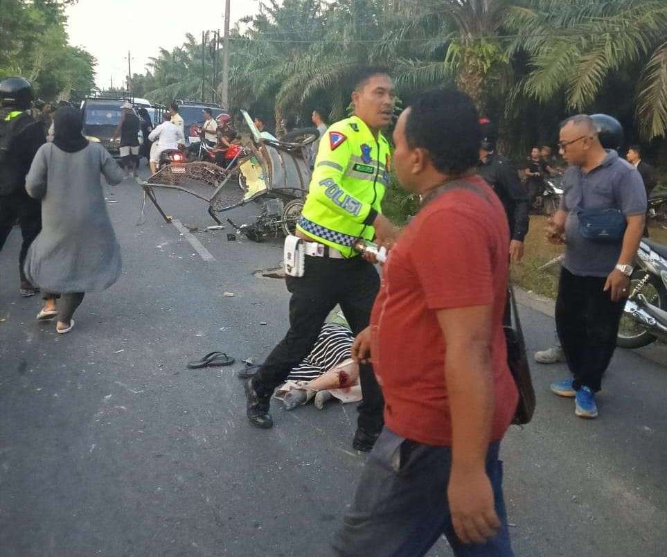 Namun saat bersamaan datang Truck Hino Elpiji plat BK 8360 VZ dikemudikan Vegi Yolanda dengan membawa penumpang Ibnu Tsafa dan langsung menabrak becak bermotor yang dikendarai Wira Wibawa.