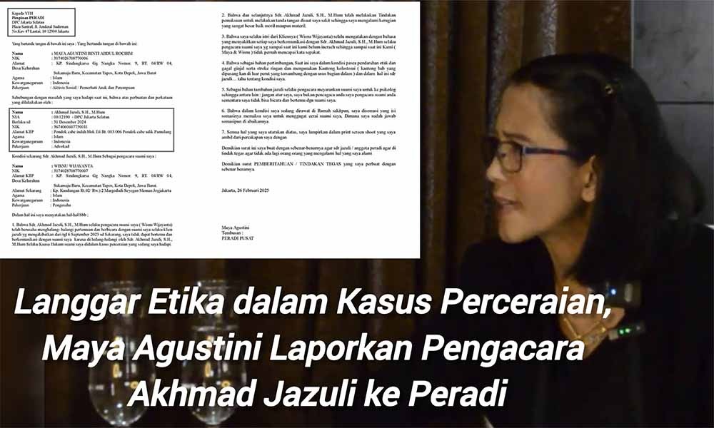 Siberpatroli.co.id // Jakarta – Seorang wanita pemerhati anak dan sosial, Maya Agustini Binti Abdul Rochim, melaporkan advokat bernama Akhmad Jazuli, S.H., M.H., ke Perhimpunan Advokat Indonesia (PERADI) DPC Jakarta Selatan. Laporan ini didasari oleh dugaan pelanggaran etika profesi yang dilakukan oleh advokat tersebut dalam menangani kasus perceraian antara Maya Agustini dan suaminya, Wisnu Wijayanta.