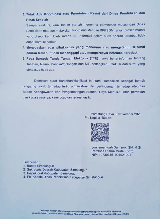 Menanggapi beredarnya surat palsu tersebut, Plt Kepala BKPSDM Kabupaten Simalungun, Jonrismantua Damanik, SH, MSi mengeluarkan surat bantahan/klarifikasi Nomor: 000.8.3.4/482/2025 yang menyatakan: