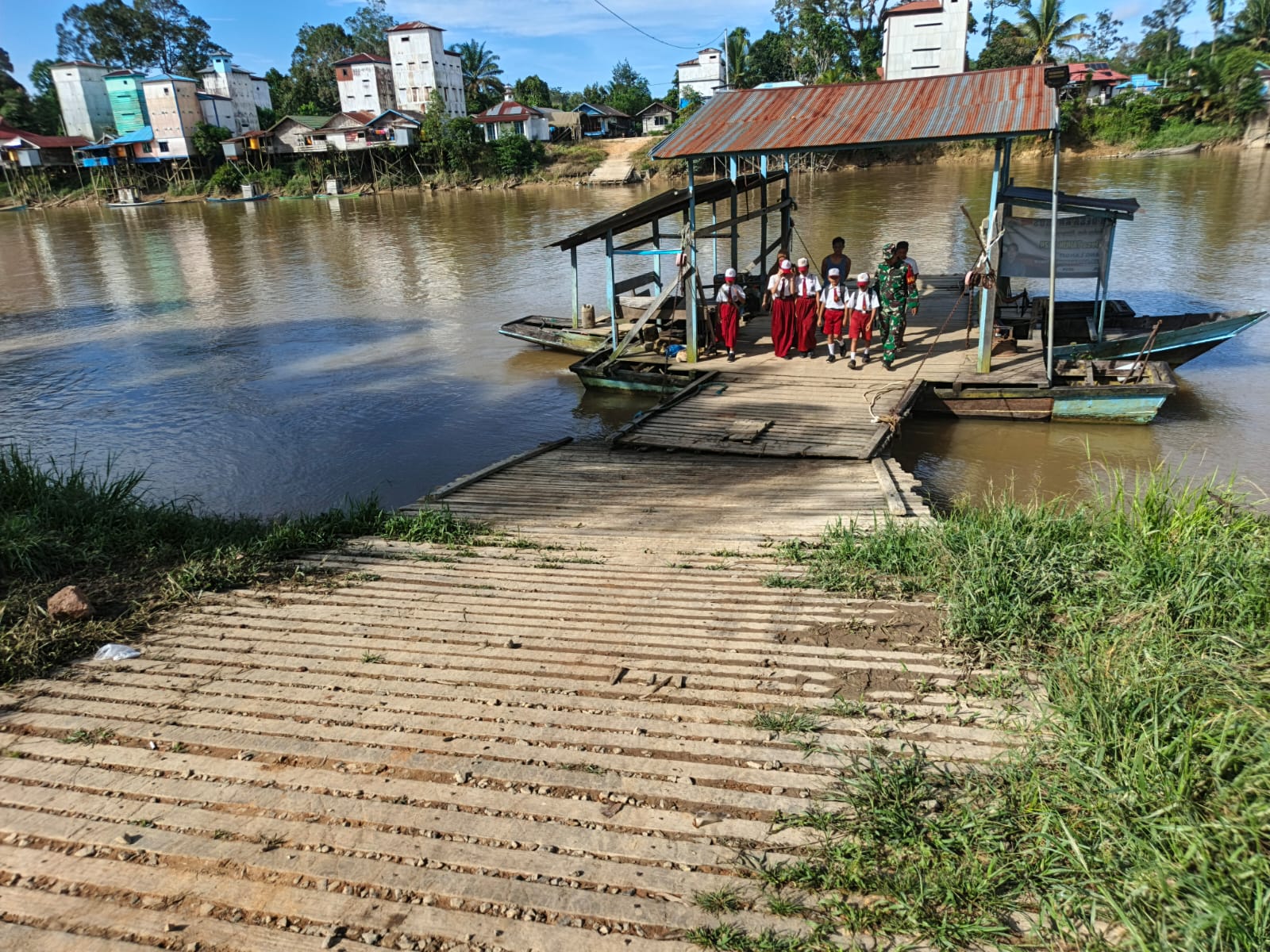 Sebelum dibangun dengan adanya program jembatan Garuda ini warga mengunakan rakit ala kadarnya demi membawa hasil tani, hasil nelayan dan mendukung anak berangkat kesekolah.