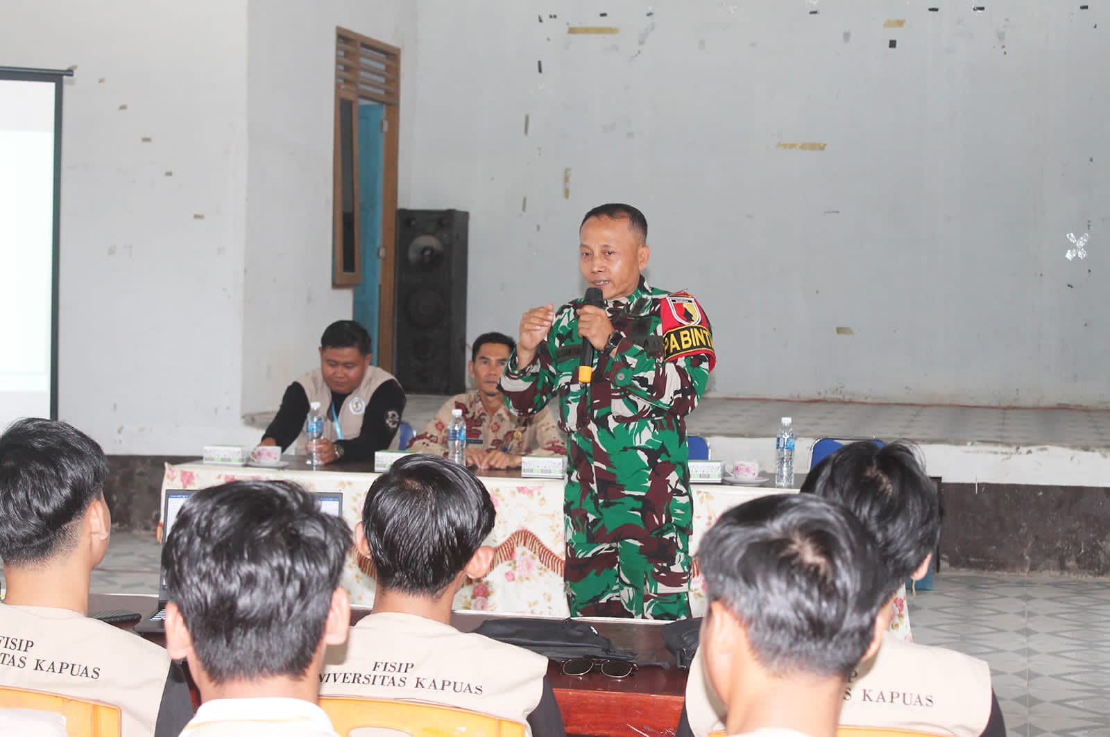 Siberpatroli.co.id // KAPUAS HULU – Pasiter Satgas Pamtas Yonkav 3/AC, Kapten Caj Jaka Krisbiantoro, memberikan pembekalan wawasan kebangsaan kepada mahasiswa Universitas Kapuas di Nanga Badau, Kabupaten Kapuas Hulu, Provinsi Kalimantan Barat.