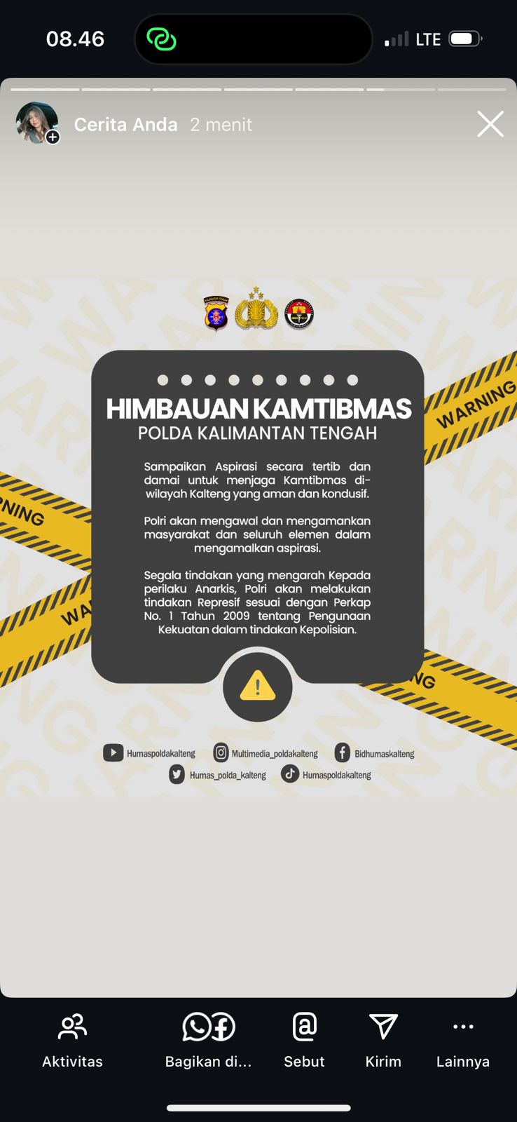 Polda Kalteng Imbau Masyarakat Tetap Tenang dan Tidak Panik di Tengah Situasi Demo
