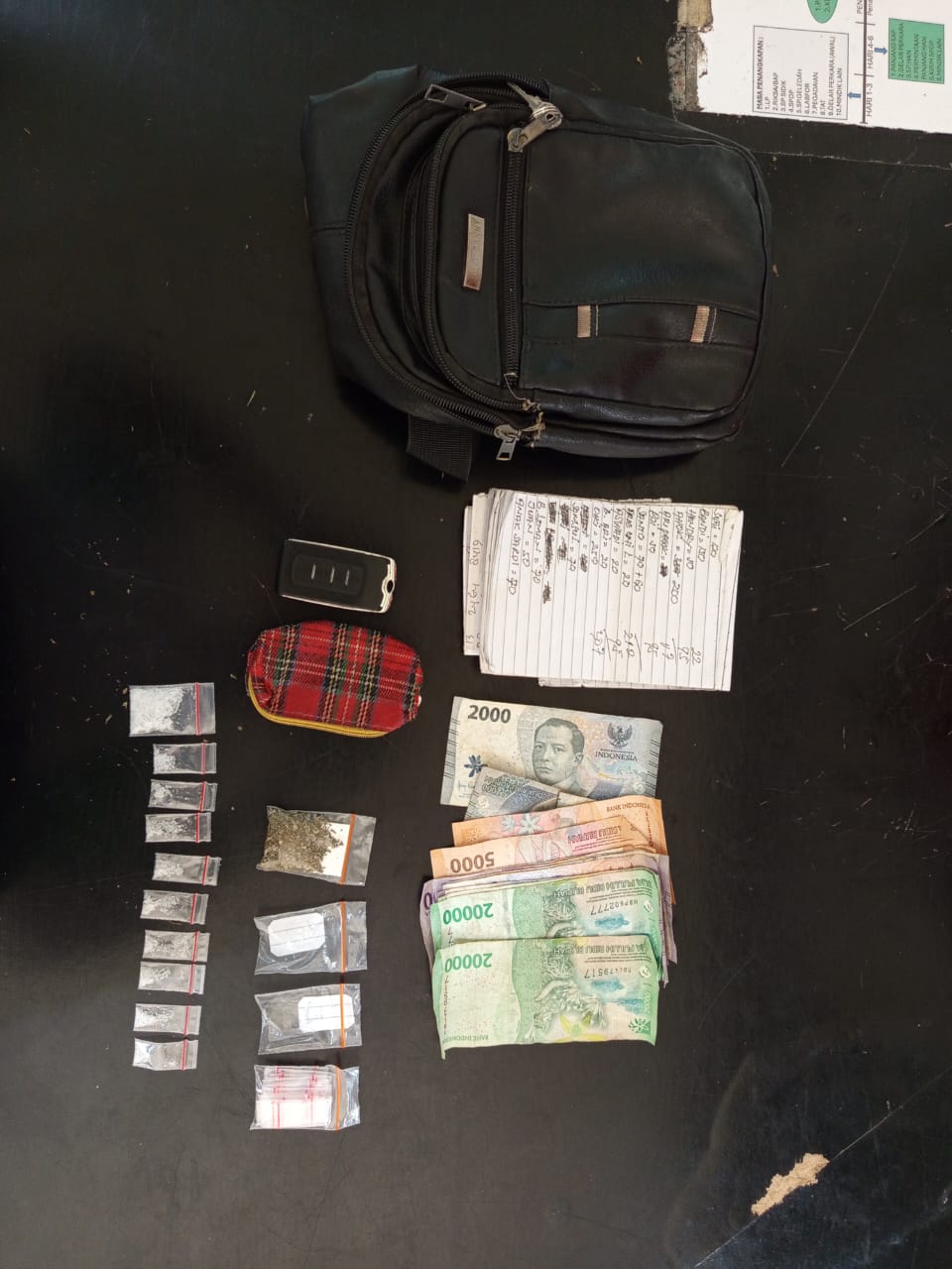 Kasat Narkoba merinci barang bukti yang berhasil diamankan melalui kerja maksimal tim, meliputi satu plastik klip sedang berisi empat plastik klip kecil diduga berisi sabu, lima plastik klip kecil berisi sabu, satu plastik klip sedang berisi sabu, satu plastik klip sedang berisi daun ganja kering beserta kertas linting, plastik klip kecil kosong untuk kemasan, satu unit timbangan elektronik merek HD warna hitam, satu buku catatan penjualan yang mencatat transaksi, dan uang tunai hasil penjualan narkoba sebesar Rp134.000.