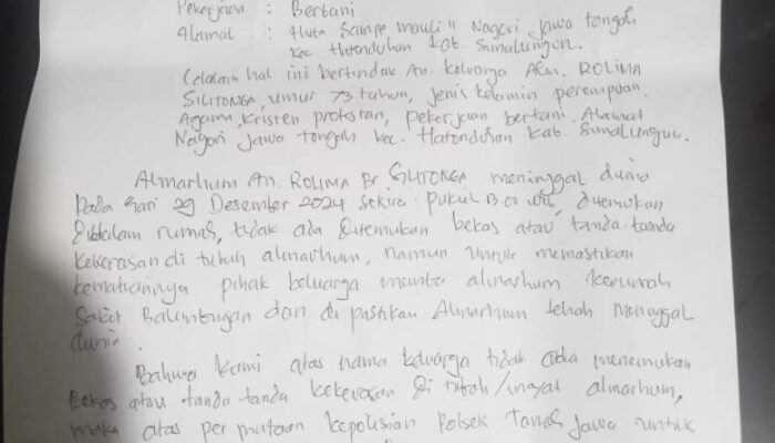 siberpatroli.co.id || SIMALUNGUN – Seorang wanita lanjut usia bernama Rolima Silitonga (73) ditemukan meninggal dunia di kediamannya di Huta Sampe Mauliate I, Nagori Jawa Tongah, Kecamatan Hatonduhan, Kabupaten Simalungun, pada Minggu (29/12/2024). Kasi Humas Polres Simalungun AKP Verry Purba mengonfirmasi kejadian tersebut pada pukul 18.00 WIB.