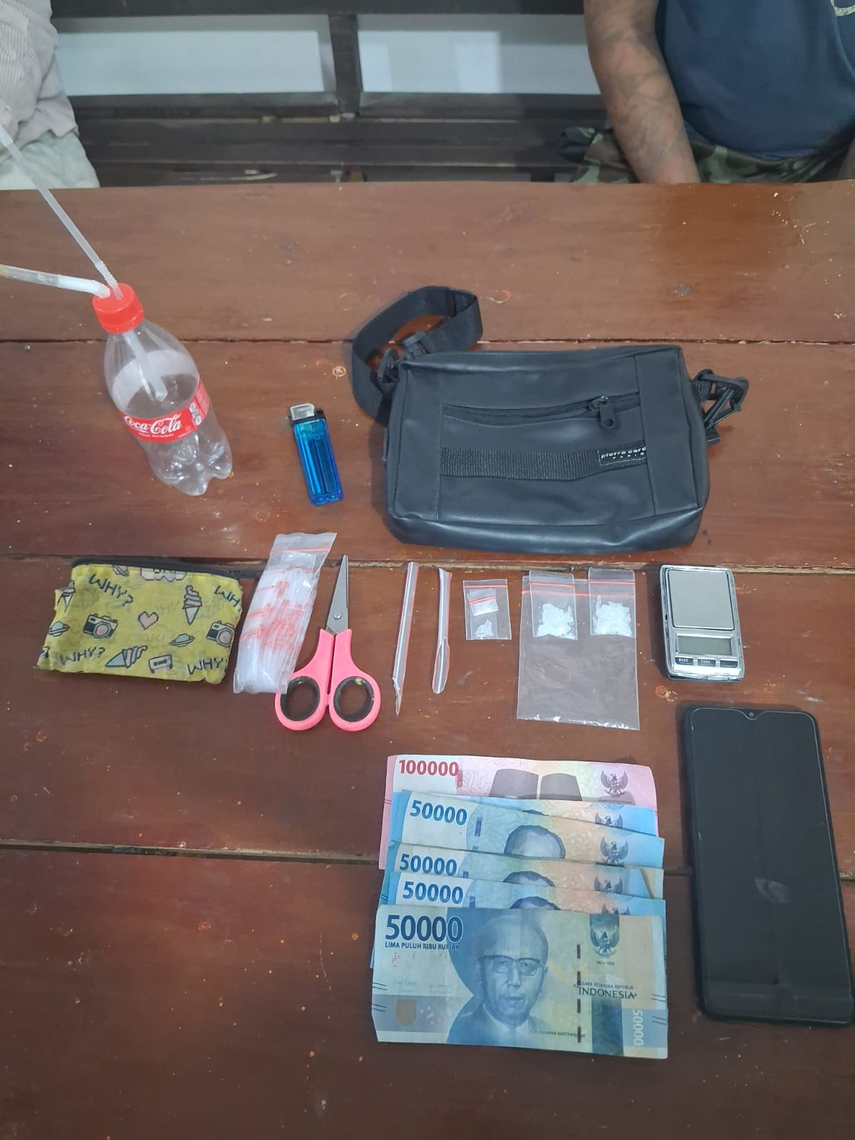 Dalam penggeledahan tersebut, petugas menemukan di tangan kiri tersangka W.A. satu plastik klip sedang berisi dua bungkus plastik klip kecil yang diduga berisi narkotika jenis sabu. Selain itu, dari dalam tas sandang hitam milik W.A. ditemukan dompet kuning bertuliskan “Why” yang berisi plastik klip kosong, satu unit timbangan elektrik warna hitam, serta dua buah sekop plastik. Petugas juga mengamankan dua bungkus plastik klip sedang yang diduga berisi sabu, satu unit bong yang terbuat dari botol plastik merek Coca-Cola yang dirangkai dengan dua buah pipet plastik dan satu kaca pyrex berisikan sisa bakaran narkoba, satu unit handphone merek Samsung warna hitam, gunting kecil warna merah, korek api, serta uang tunai sebesar Rp400.000 yang diduga merupakan hasil penjualan. Secara keseluruhan, total narkotika jenis sabu yang berhasil diamankan mencapai berat 2,69 gram.