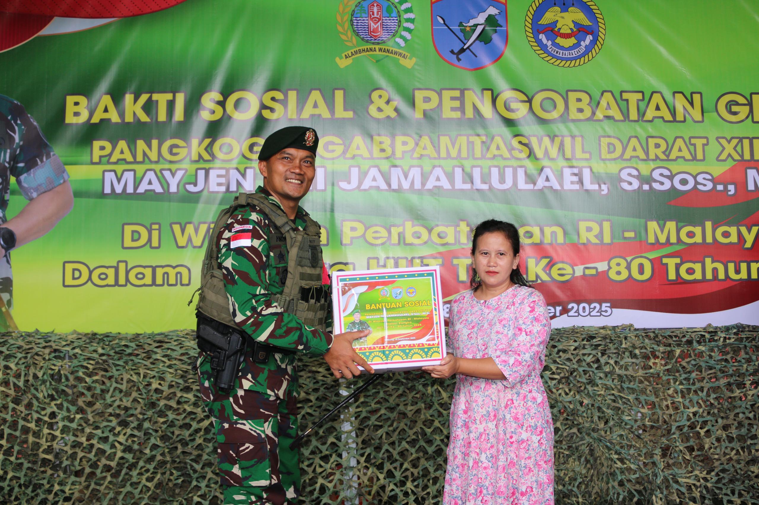 Kunjungan dilanjutkan dengan kegiatan Bantuan Sosial (Bansos) dan Pelayanan Kesehatan Gratis bagi masyarakat sekitar Entikong. Program ini merupakan wujud nyata kepedulian TNI terhadap kesejahteraan warga di sekitar wilayah operasi.