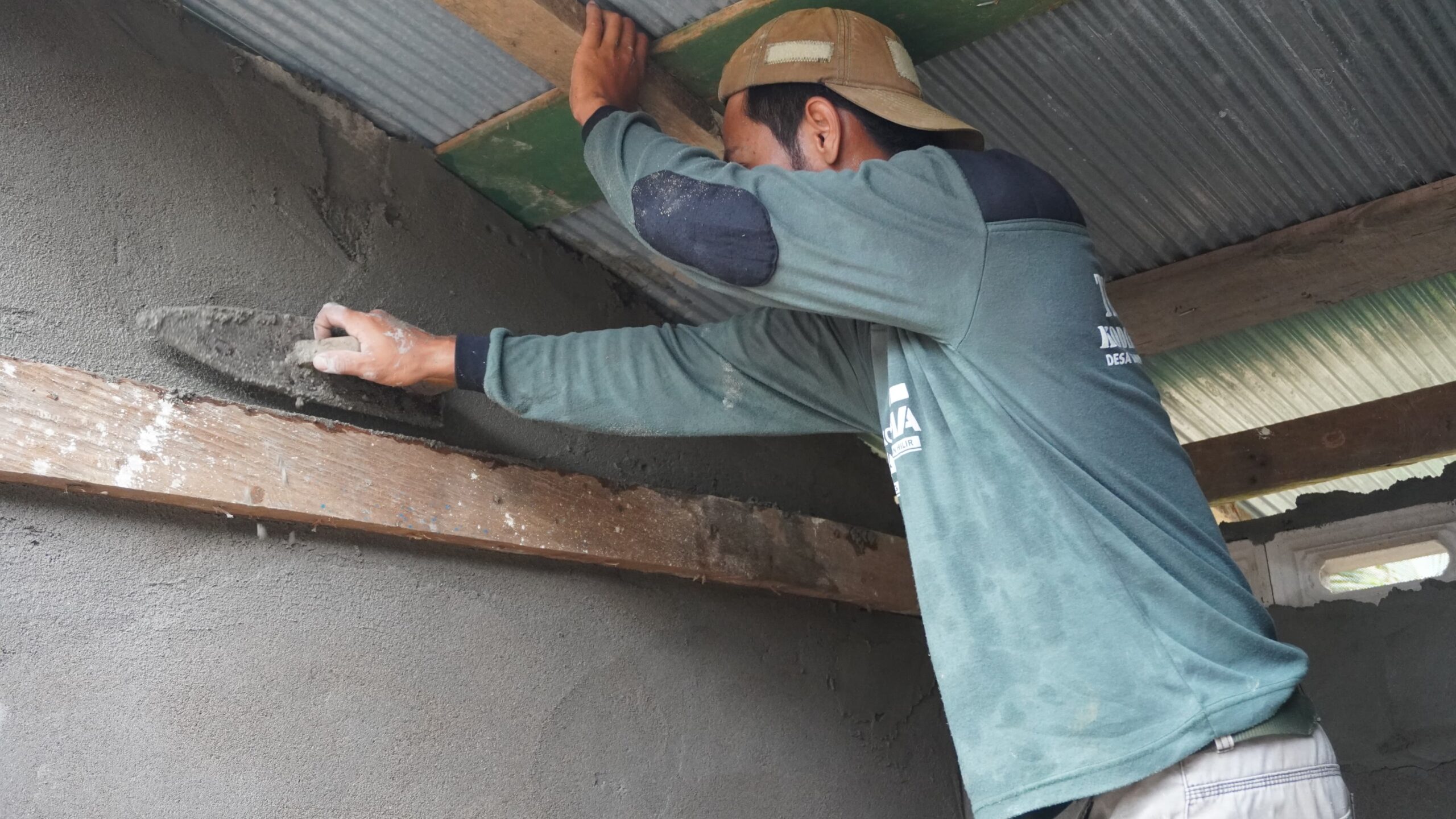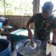 Terlihat salah satu anggota Satgas tengah fokus mengaplikasikan adukan semen pada dinding bangunan MCK, didampingi sebuah gerobak dorong kuning berisi material. Semangat gotong royong antara prajurit TNI dan warga menjadi kunci utama dalam upaya percepatan penyelesaian program TMMD ini.