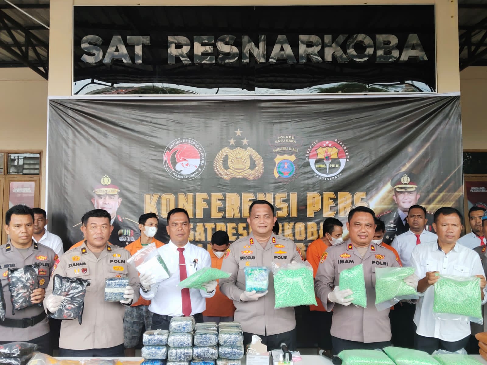 “Didalam kendaraan petugas menemukan dua tas sandang hitam.Dalam tas pertama ditemukan 26 bungkus kemasan bertuliskan teh cina warna hijau yang berisi narkotika jenis sabu-sabu atau seberat 28.135 gram dan satu tas lagi berisi 11 bungkus pil esktasi atau 60.940 butir bergambar Tri Sula warna hijau ,” papar AKBP Doly Nelson Nainggolan didampingi Waka Polres Batu Bara Kompol Imam,Kasat Narkoba AKP Ramses Panjaitan,saat press realease,di halaman Satres Narkoba Polres Batu Bara,Senin (04/08/2025) sekira pukul 09.00 Wib.