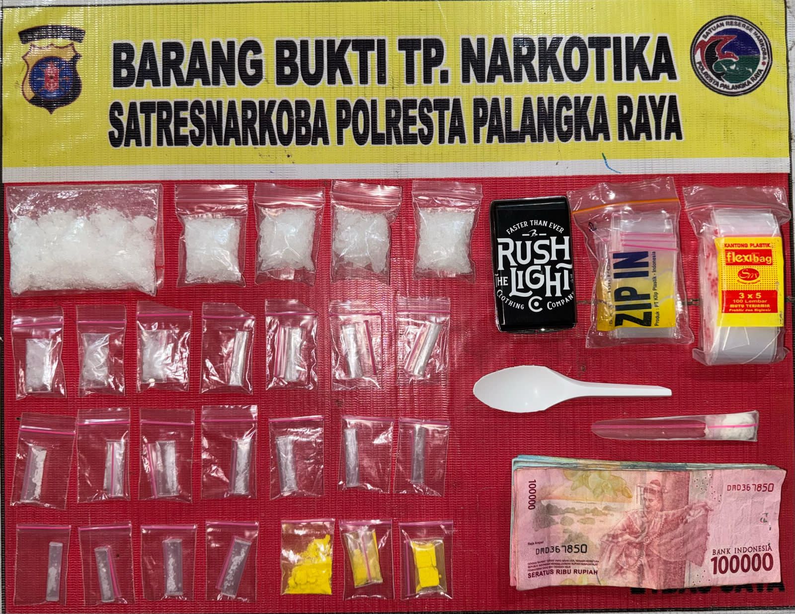 Selain itu, turut diamankan 1 buah kaleng permen merek Eclipse warna hijau, 1 kotak merek Monter warna hitam, 1 dompet warna hitam, 1 unit handphone OPPO warna biru, serta uang tunai sebesar Rp 1.080.000,- yang diduga hasil transaksi narkotika.