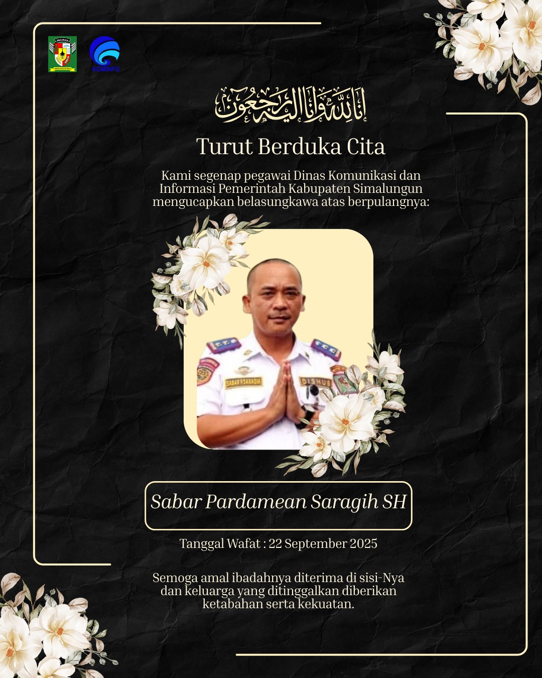 Semoga rahmat dan berkah Allah tercurah kepada saudara kami SABAR PARDAMEAN SARAGIH.SH dan semoga Dia memberikan kesabaran dan ketenangan bagi Bapak/Ibu dan segenap keluarga yang ditinggalkan. Aamiin.