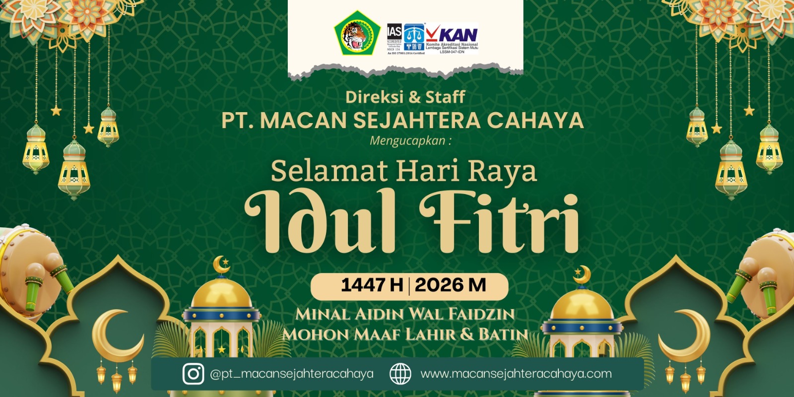 Selamat Hari Raya Idul Fitri 1 Syawal 1447 Hijriyah tahun 2026, semoga idul fitri tahun ini menjadi kekuatan baru bagi kita dalam upaya membangun bangsa dalam makna yang hakiki, baik pembanguan fisik material juga mental spiritual, serta mengokohkan diri kita dalam berbangsa dan bernegara.[*]