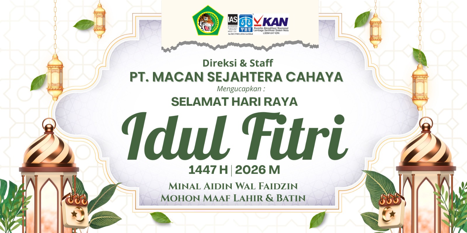 Selamat Hari Raya Idul Fitri 1 Syawal 1447 Hijriyah tahun 2026, semoga idul fitri tahun ini menjadi kekuatan baru bagi kita dalam upaya membangun bangsa dalam makna yang hakiki, baik pembanguan fisik material juga mental spiritual, serta mengokohkan diri kita dalam berbangsa dan bernegara.[*]